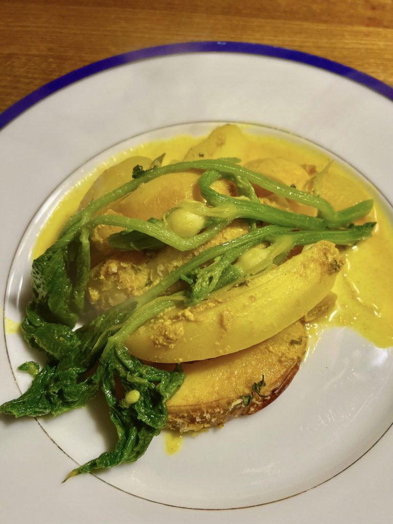 Herbstlicher Kartoffelgratin mit Kürbis Triebspitzen