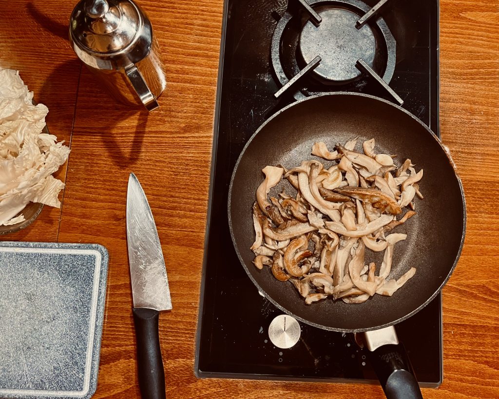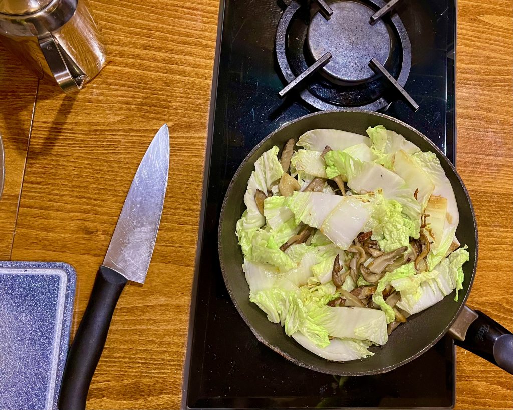 Erhitze das Olivenöl in einer Pfanne und brate den Knoblauch goldbraun an. Füge die Pilze in Streifen hinzu. Schneide die Chinakohlblätter in breite Streifen. Gib zuerst die dickeren Teile der Blätter in die Pfanne und nach ein paar Minuten die restlichen.