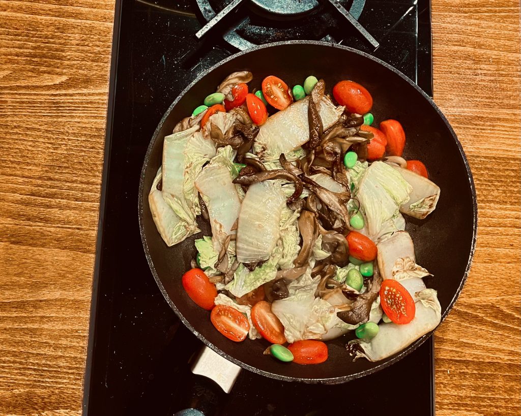Chinakohl ist das zweitbeste Gemüse, wenn es um die Nährstoffdichte geht. Pilze und Edamebohnen liefern das Eiweiß und ersetzen das Fleisch. Tomaten enthalten Vitamin C, das dem Körper dabei hilft, das Eisen aus dem Kohl besser aufzunehmen.