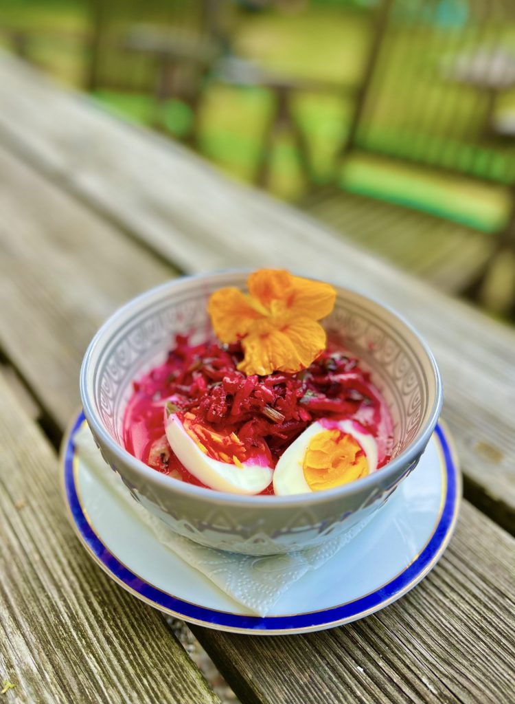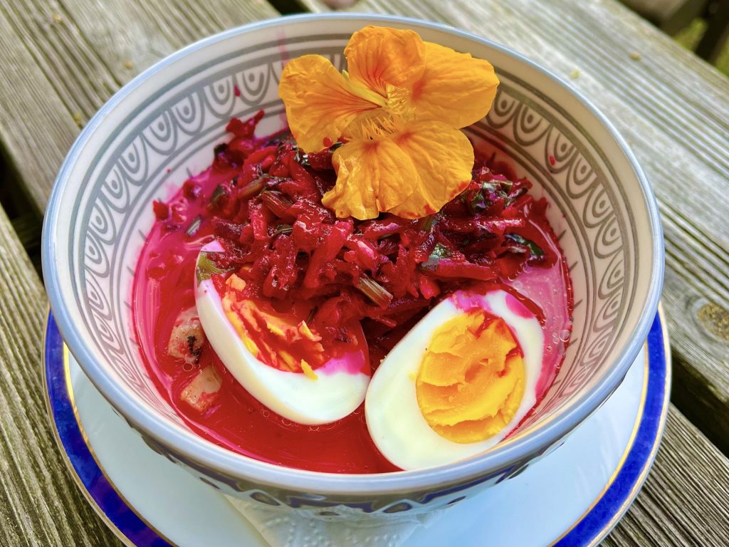 Die Rote Bete von den Blättern trennen. Die Knollen schälen und grob reiben. Die Blätter verlesen, waschen und klein schneiden. Alles in einen Topf geben, mit Wasser bedecken und salzen. Nach ca. 10 Minuten Kochzeit die Feuerstelle ausschalten. Wenn die Beete ausgekühlt ist, die restlichen flüssigen Zutaten zufügen. Die Gurke und die Radieschen grob reiben und unter die kalte Suppe mischen. Nun mit Salz, Pfeffer und 1–2 EL Zitronensaft würzen. Die Suppe für ein paar Stunden kühl stellen. Vor dem Servieren 1–2 EL gehackten Dill zugeben und nach Bedarf erneut abschmecken. Anschließend mit hartgekochten Eiern und/oder Salzkartoffeln servieren.