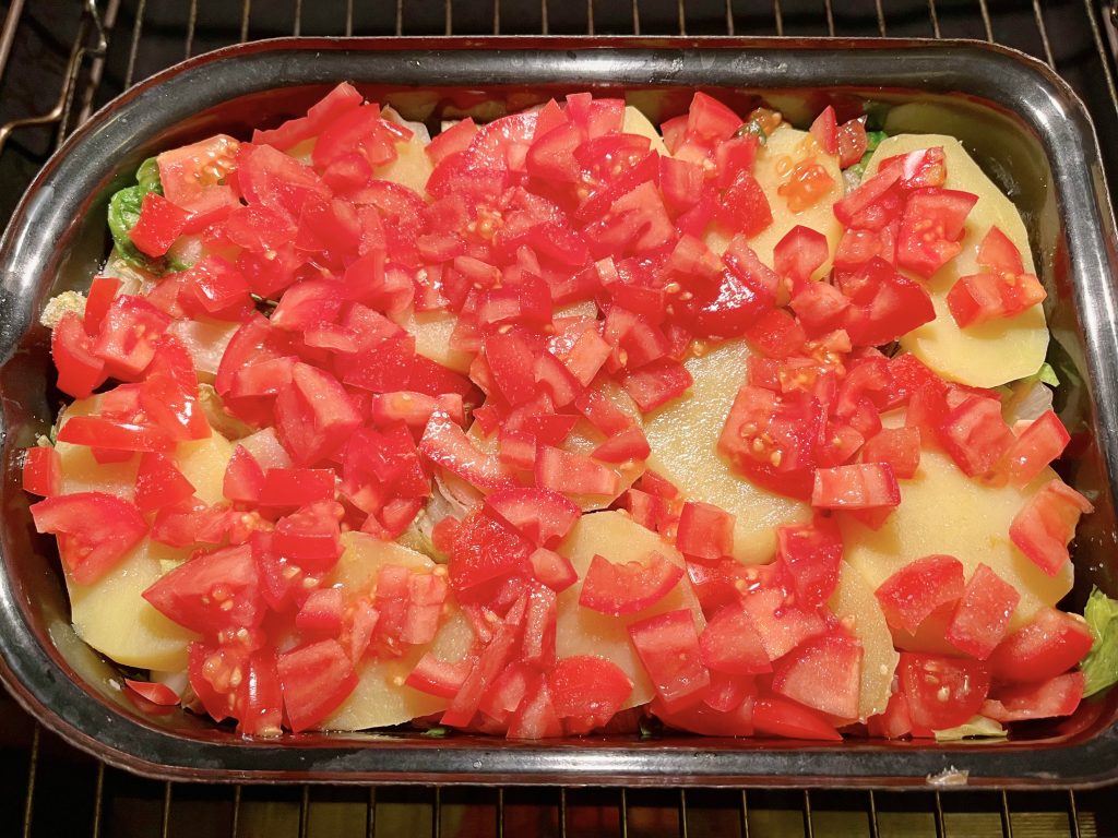 Kartoffeln schälen, in 0,5 cm dicke Scheiben schneiden und in Salzwasser vorkochen. Die Kartoffeln abgießen und kurz ausdampfen lassen. Wenn der Fisch viele Gräten hat, das Filet zwischen zwei Holzspießchen legen und in der Breite einige Millimeter einschneiden – die Spießchen dienen hier als Durchschneideschutz. Den Boden einer Auflaufform mit 2 – 3 Esslöffeln Öl bestreichen. Als erste Schicht 1/3 der Kartoffeln hineingeben. Auf die Kartoffeln kommt der geputzte und klein geschnittene Endiviensalat, dann der Fisch. Dann wieder Kartoffeln, Endivie und Fischfilets. Die letzten zwei Schichten bestehen aus Kartoffeln und Tomaten. Jede Schicht mit Salz und Pfeffer würzen, die oberste Schicht zum Schluss mit 2-3 EL Olivenöl beträufeln. Im vorgeheizten Backofen bei 190 °C 45 Minuten überbacken.