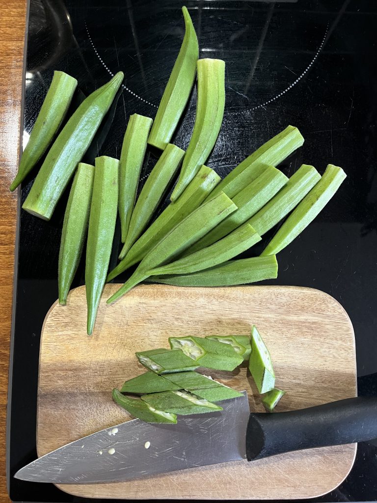 Okra und Tomaten waschen und abtrocknen. Die Okraschoten in mundgerechte Stücke schneiden. Eine Pfanne mit 2 EL Olivenöl erhitzen und die Okraschoten darin mit dem Knoblauch goldbraun anbraten. Die klein geschnittenen Tomaten hinzufügen. Mit Salz würzen. Ein Stück Chili oder Peperoncino passt auch gut dazu. Mit heißem Reis anrichten und genießen.