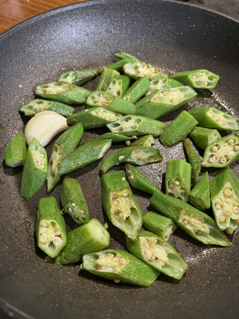 In einer Pfanne zwei Esslöffel Olivenöl erhitzen, bis es angenehm warm schimmert. Dann die Okra zusammen mit dem Knoblauch hineingeben und alles bei mittlerer Hitze goldbraun anbraten. Während die Okra langsam Farbe annimmt, entfaltet sich ein wunderbar aromatischer Duft, der sofort Lust aufs Essen macht.