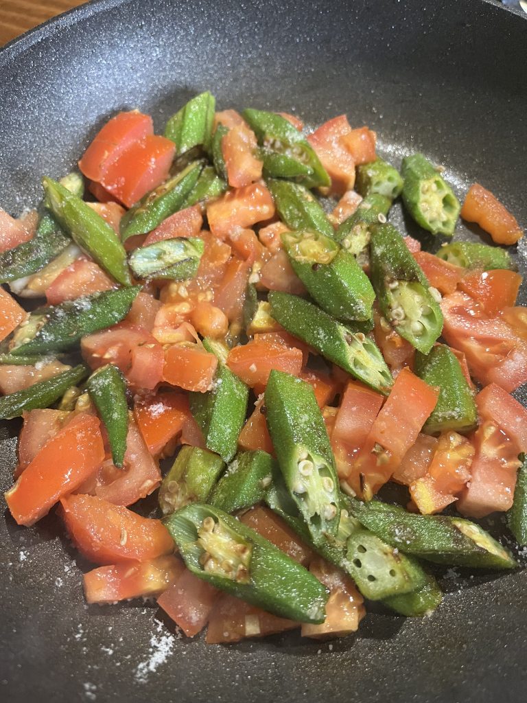 Sobald die Okra leicht gebräunt ist, die klein geschnittenen Tomaten hinzufügen. Alles gut vermengen und mit etwas Salz würzen. Wer es gerne etwas schärfer mag, kann jetzt noch ein Stück Chili oder Peperoncino dazugeben – das bringt eine angenehme, wärmende Schärfe ins Gericht.
