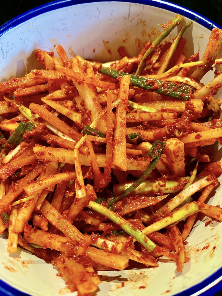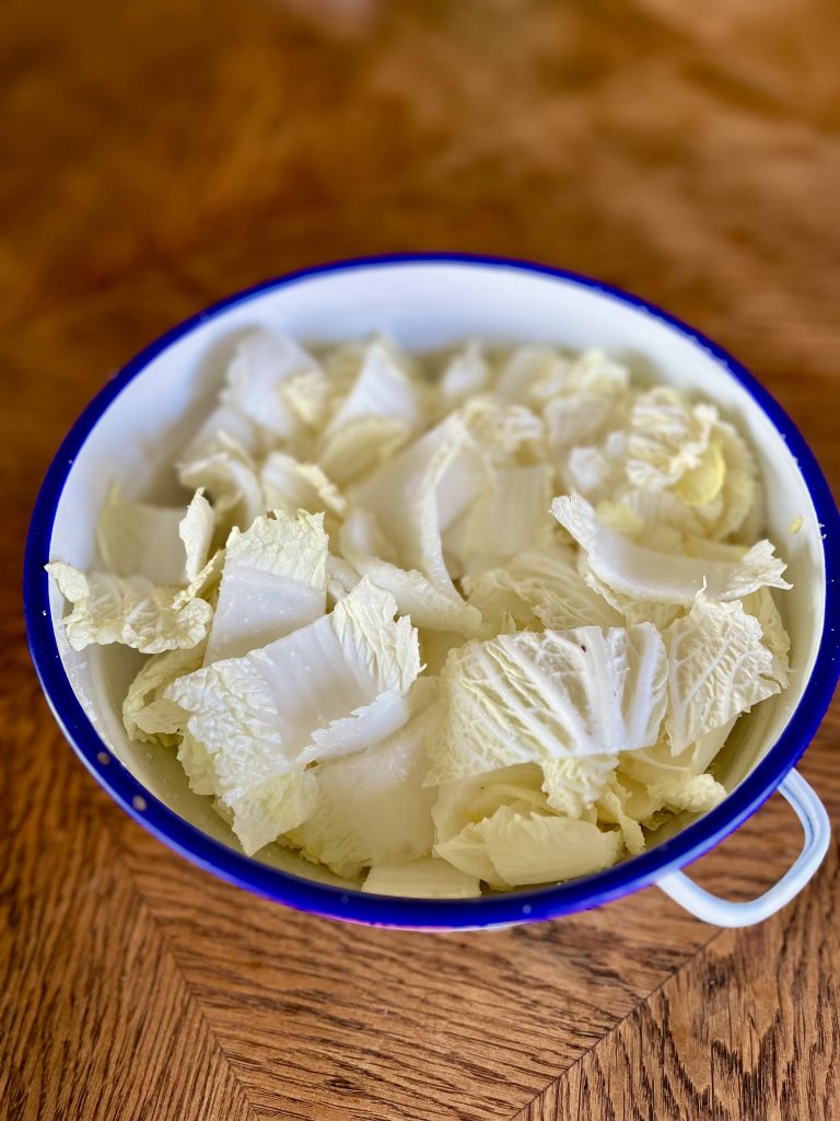 Chinakohl längs vierteln, in Stücke schneiden, waschen und trocken schleudern. Kohl mit Salz mischen, ca. 1 Stunde ziehen lassen. Karotte, Apfel, Frühlingszwiebeln und Rettich in feine Stifte schneiden. Reismehl mit Wasser mischen und auf kleiner Flamme aufkochen. Abgekühlte Masse mit Gemüsestiften und koreanischem Chili mischen. Chinakohl in frischem Wasser abspülen und trocken schleudern. Mit der Gemüsepaste mischen und dicht in ein Glas füllen. Zwei Tage bei Zimmertemperatur ziehen lassen, dann in den Kühlschrank stellen. Nach einigen Tagen kann die erste Verkostung beginnen.