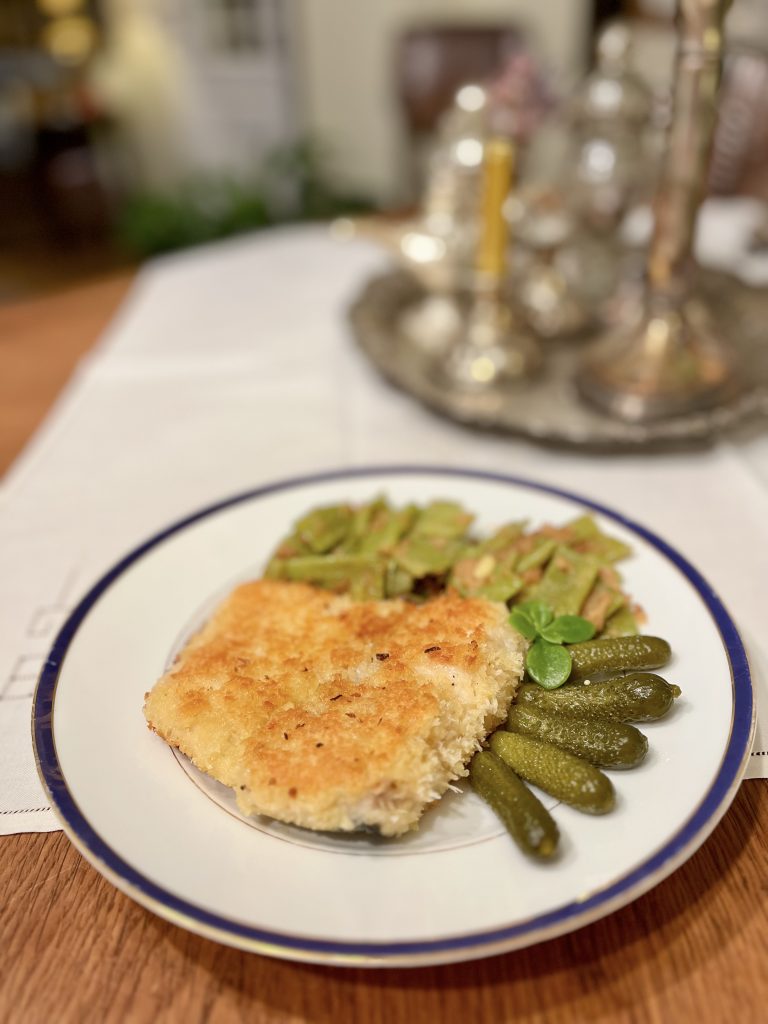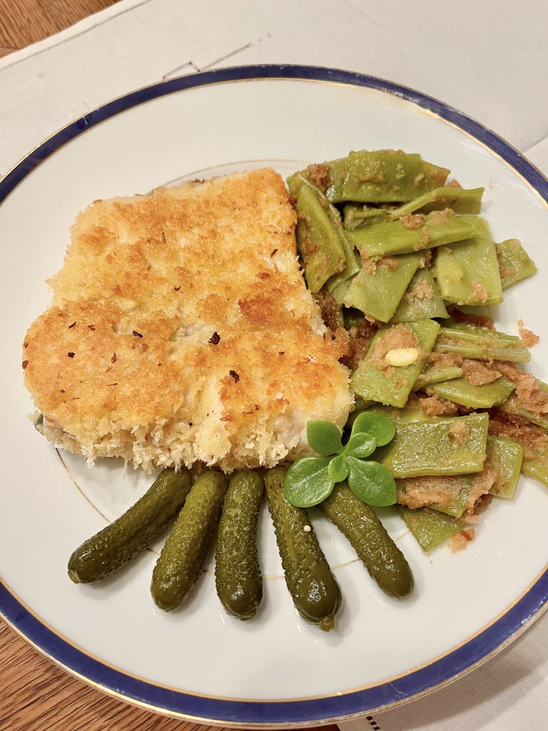 Fisch und Bohnen auf die Tellern einrichten und mit Gewürzgürkchen schmücken 🙂