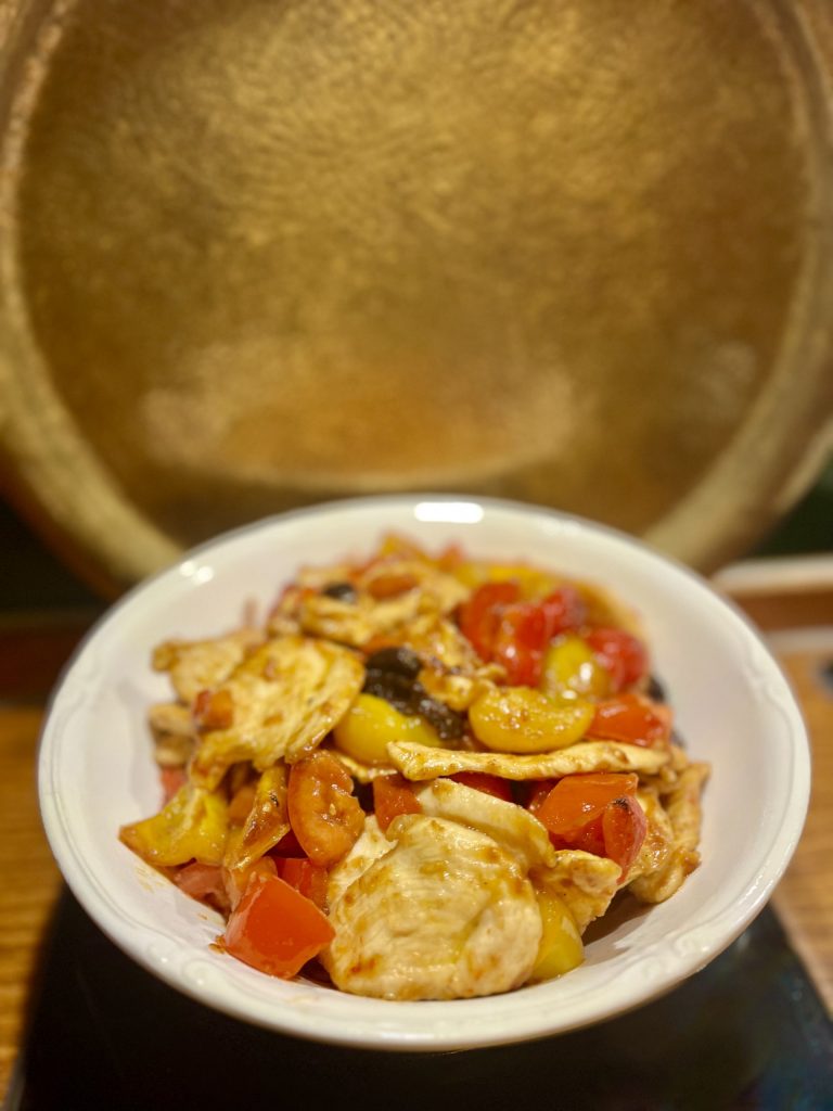 In einer zweiten Pfanne erneut etwas Olivenöl erhitzen und darin die Paprika anbraten. Sobald sie weich sind und zudem leichte Röstaromen entwickelt haben, die gewürfelten Tomaten sowie die entsteinten Kalamata-Oliven hinzufügen. Wenn die Tomaten beginnen, sich aufzulösen und eine saftige Sauce zu bilden, die Hähnchenscaloppine wieder in die Pfanne geben. Anschließend alles noch einige Minuten sanft ziehen lassen, damit sich die Aromen gut miteinander verbinden.