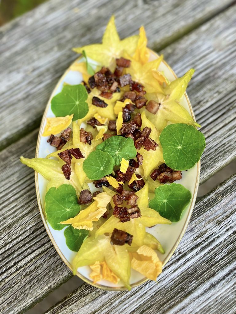 Die Karambole waschen, trocken tupfen und in ca. 3 mm dicke Sterne schneiden. Auf einer Platte schön verteilen, mit 1 EL Olivenöl würzen und leicht salzen. Den etwas abgekühlten Speck in Würfel schneiden und auf den Sternen verteilt anrichten.