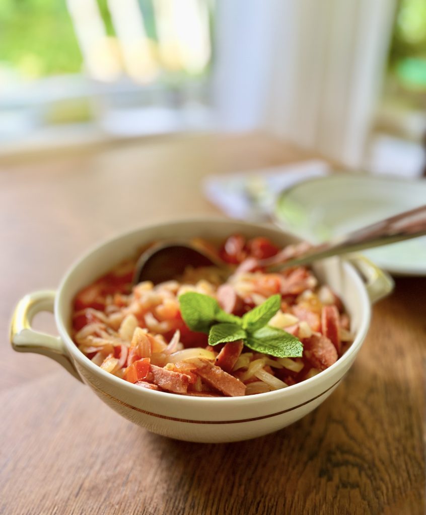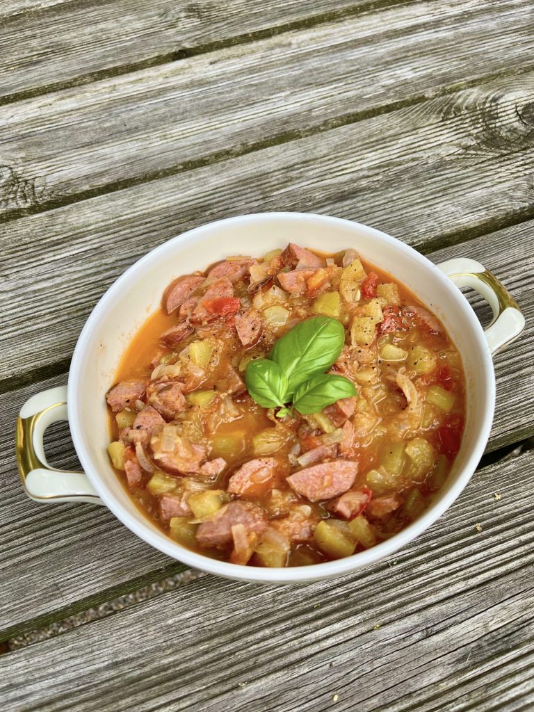 Das Zucchini-Bigos gehört zu meinen Lieblingsrezepten für den Sommer. Großgewachsene Zucchini schmecken mild und süß, ganz anders als die kleinen, die den Gerichten einen herzhaften Geschmack verleihen. Die Wurst aus dem Rezept kann durch Fleisch ersetzt werden. Dadurch verlängert sich die Kochzeit, aber ein Versuch ist es wert. Für die vegane Variante können Tofu oder Tempeh verwendet werden. Auch die Zucchini kann durch anderes Gemüse ersetzt werden. Auf den hier angefügten Fotos habe ich das Bigos mit Mairübchen statt Zucchini zubereitet.
